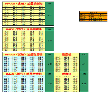 使用PY-705印刷后產(chǎn)品水滴角均在標(biāo)準(zhǔn)范圍內(nèi),CPK>1.33,表現(xiàn)較穩(wěn)定
